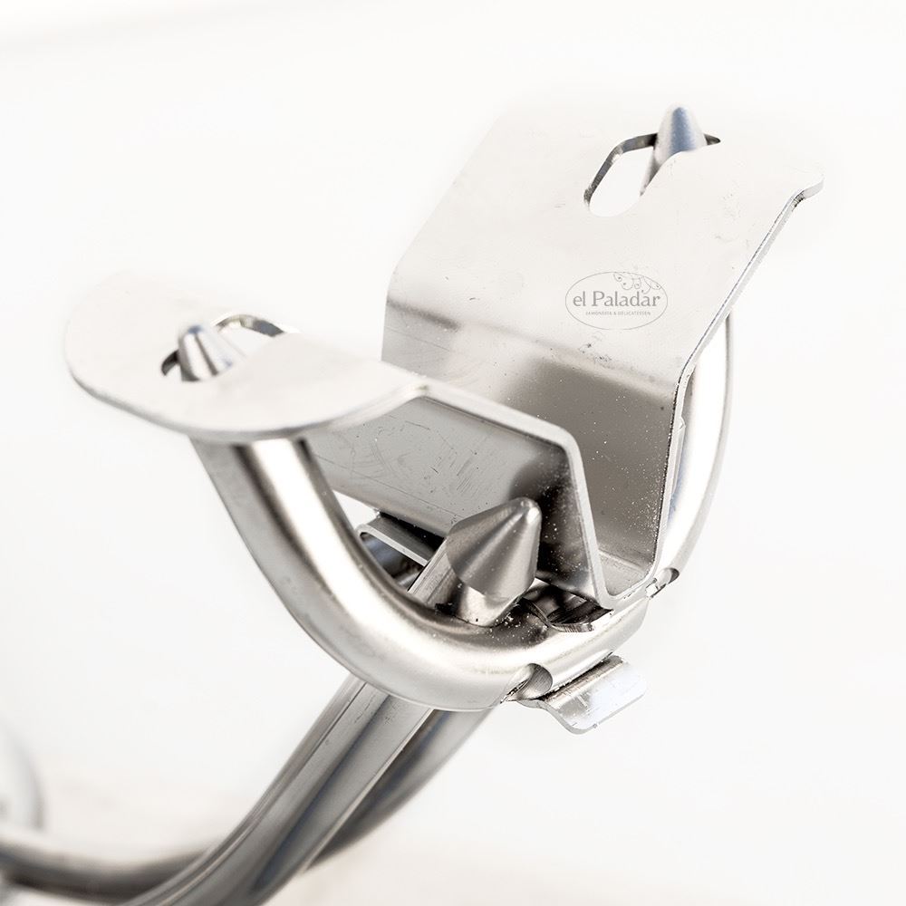 Polkrogla držala za šunko je sestavljena iz treh glavnih delov in štirih visokotlačnih vzmeti. To zagotavlja izjemno visoko natančnost pri nastavitvi položaja držala, kar vam omogoča, da izberete najboljši položaj za polaganje in rezanje šunke. Mehanizem za zaklepanje položaja držala se doseže s pomočjo ekscentrične ročice, ki sprosti pritisk. Zasnova polkrogle je popolnoma zaprta, kar ščiti zobnike osrednjega sistema za gibanje in nastavitev držala za šunko ter preprečuje poškodbe zaradi maščobe in ostankov.